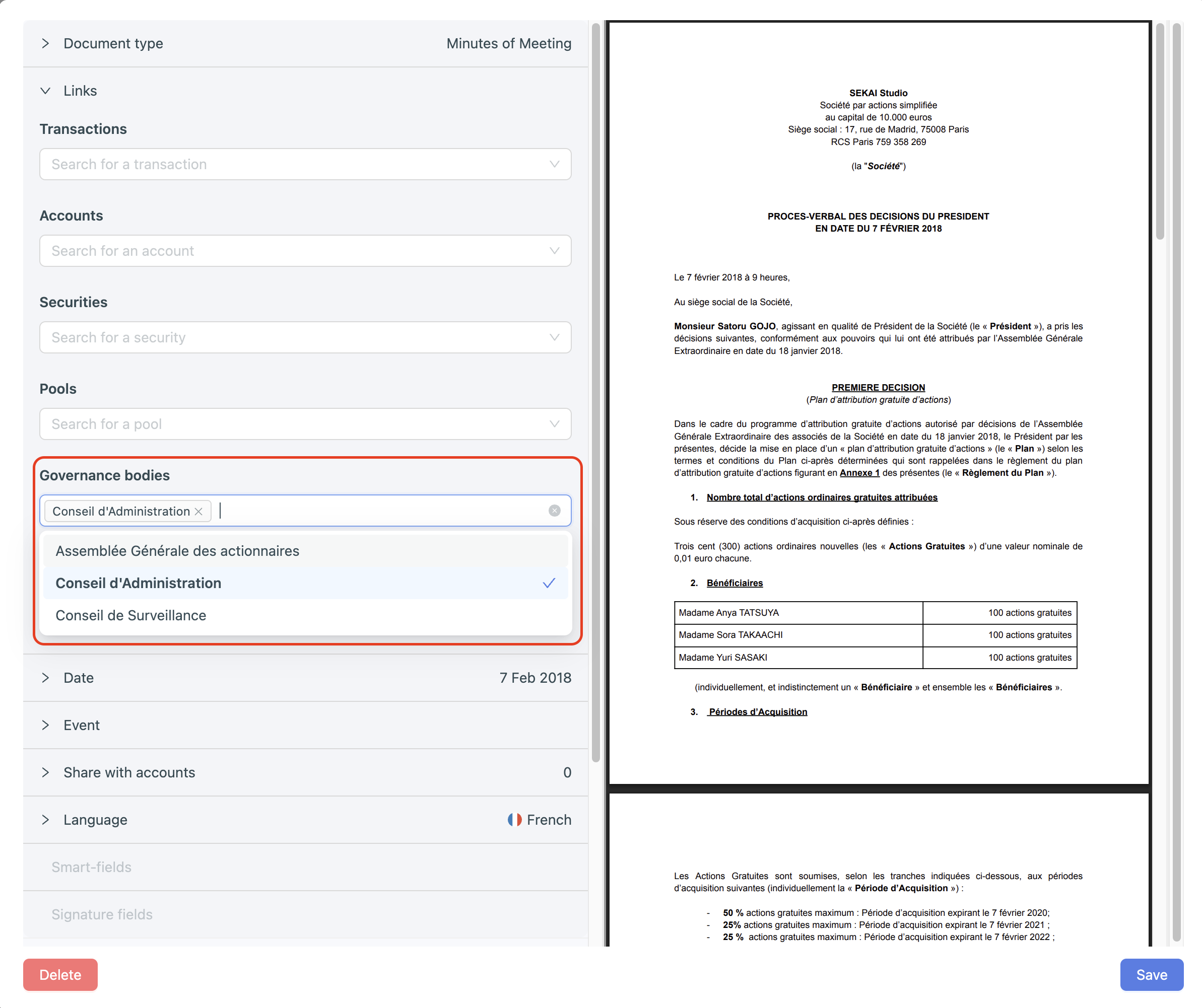Afterwards, as soon as you upload a document to your space, you can link it to the relevant governance body in the document details.