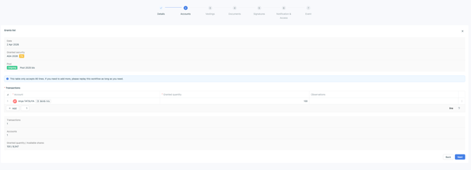 - In the Accounts step, select the account, the quantity granted, and the vesting start date. If your free share grant includes multiple accounts, you can add additional lines.