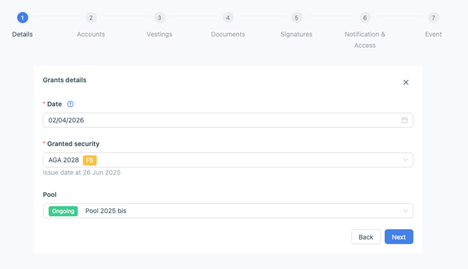 - In the Details step, choose the grant date, then select the security and the pool.