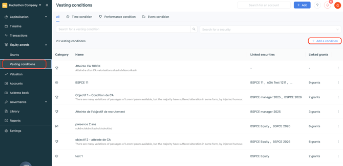 ① Go to Equity Awards > Vesting conditions > Add a condition.