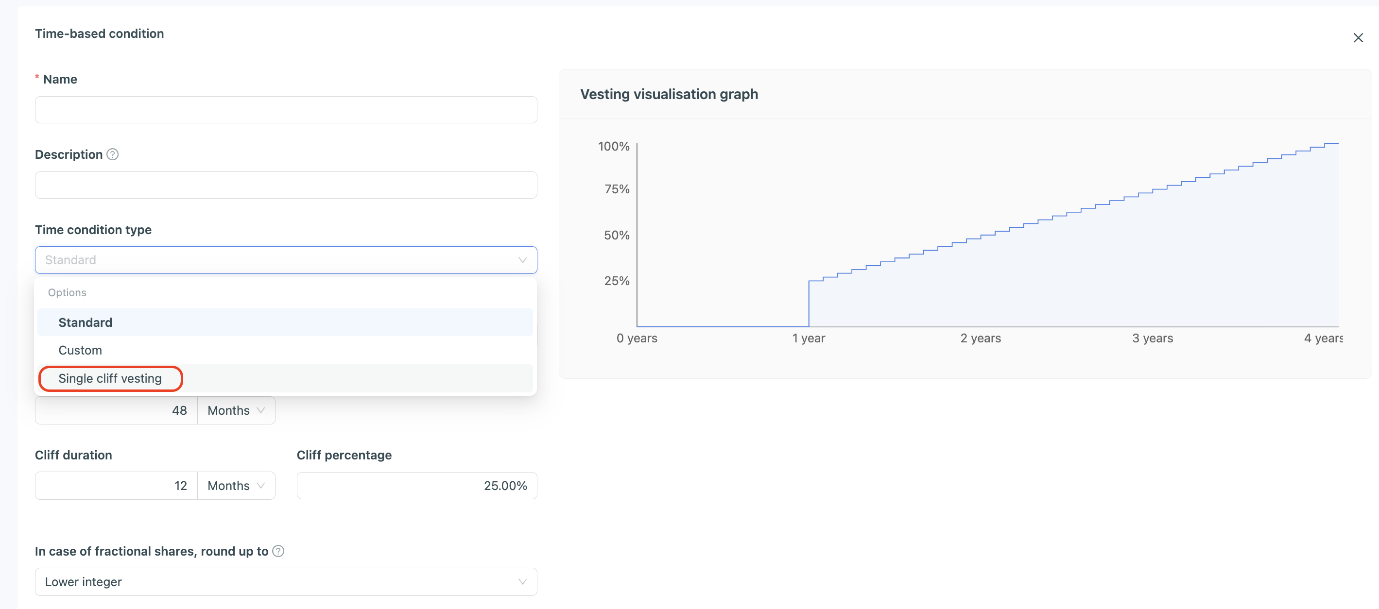 ③ Setup acquisition calculation rules. The fields depend on the type of vesting you've chosen: