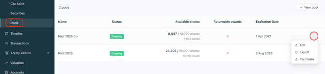 ③ A window appears, allowing you to edit, export or terminate your pool: