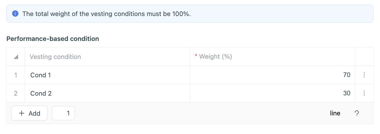 ⚠️ If you add performance conditions, you must specify the vesting percentage linked to each objective. The total of all objectives must equal 100%.