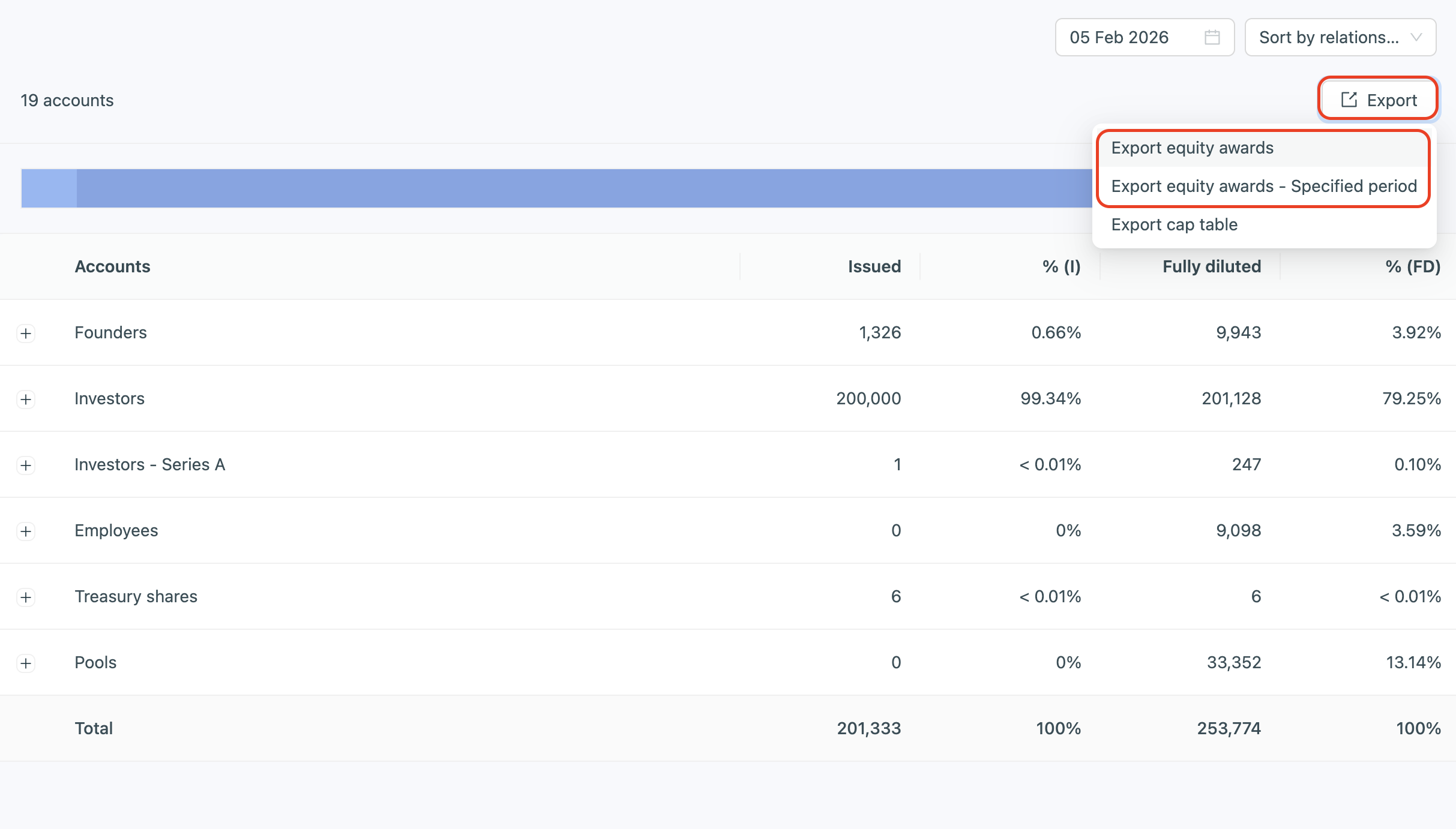 Go to the Cap table, click on Export Equity awards / Export equity awards - specified period, this downloads an Excel file listing your equity awards.