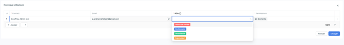 → Sélectionnez les permissions du nouvel administrateur : Gérant de la société, Gestionnaire, Observateur, Superviseur.