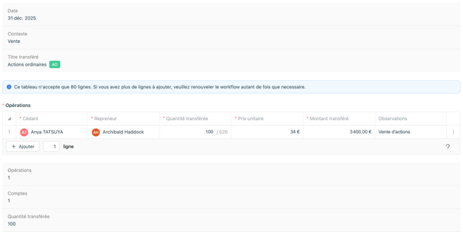 Lorsqu'un actionnaire vend ou transfère tout ou partie de ses titres à un autre actionnaire, une opération doit être enregistrée sur Equify.