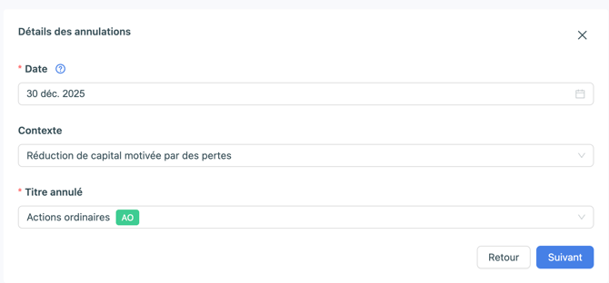 Renseigner la date de rachat, le contexte de la réduction de capital ainsi que le titre concerné.