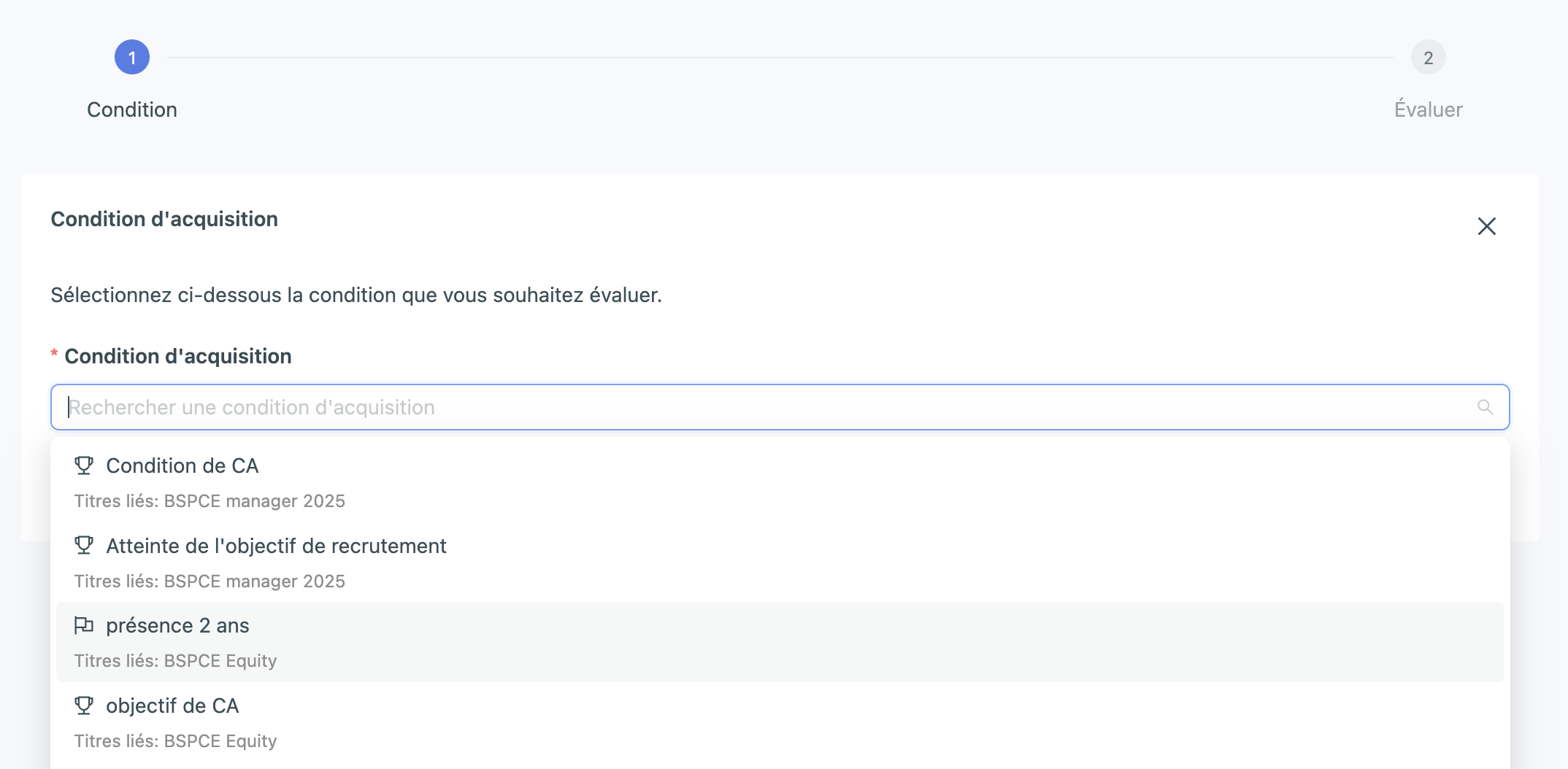 ⚠️ Attention, si vous avez indiqué un taux minimal de complétion dans le paramétrage de la condition, il conviendra de le respecter. Dans l'exemple ci-dessus, l'objectif est 2 ans de présence dans la société. Si l'objectif est atteint, alors 100% de la quantité attribuée est acquise / ou en cours d'acquisition, si l'objectif n'est pas atteint, alors le titulaire perd l'intégralité de son attribution.
