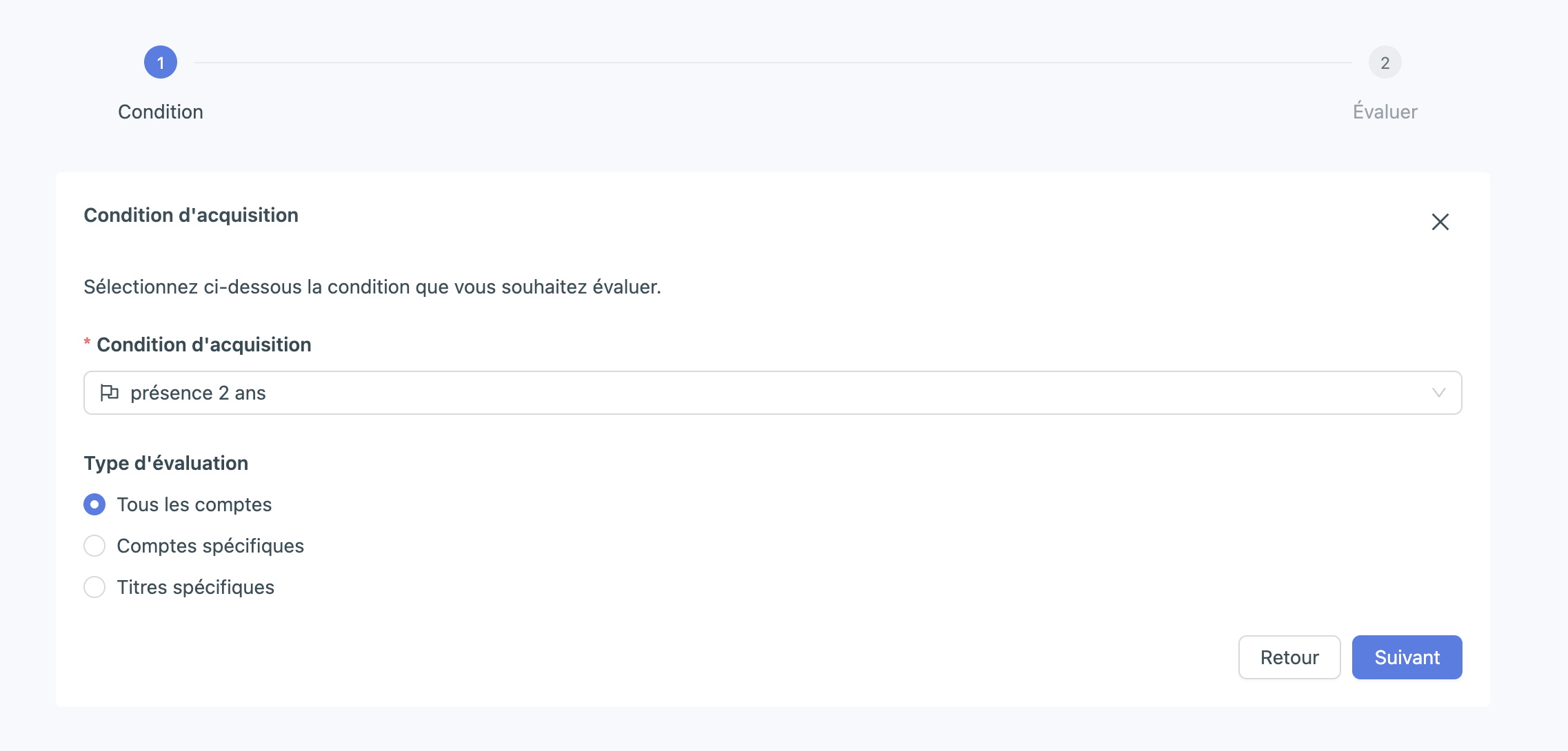 💡 Vous pouvez filtrer les comptes et les titres liés à la condition que vous souhaitez évaluer. Par défaut, Tous les comptes ressortiront.