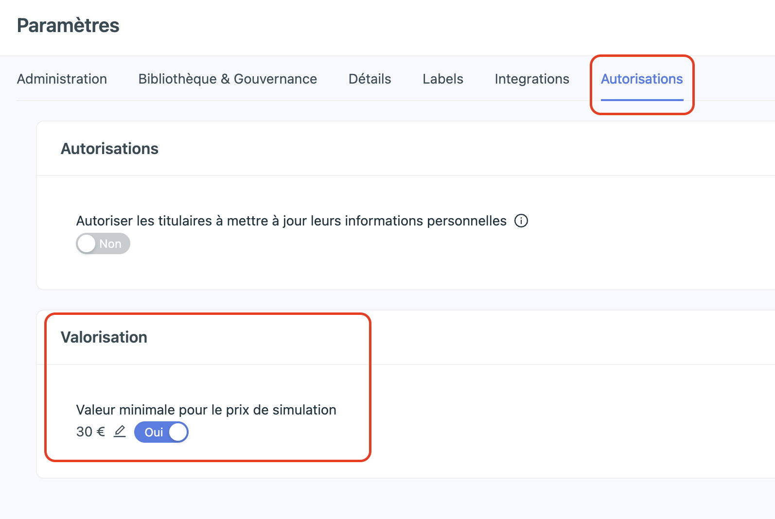 ⚠️ Si vous ne souhaitez pas que le dernier prix par action apparaisse, vous pouvez vous rendre dans l'onglet Paramètres > Autorisations > indiquer une valeur minimale pour le prix de simulation. Ce prix apparaitra alors par défaut dans le simulateur.